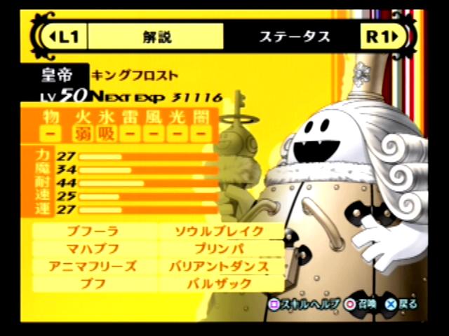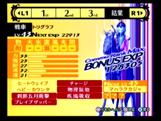 前置きで書き損ねましたが、5スキル継承について。5スキル継承発生の条件は、素材ペルソナが全て8個スキルを覚えてること、素材の全スキルと合体結果ペルソナが持つスキル全てが、一つも重複しないこと、になります。