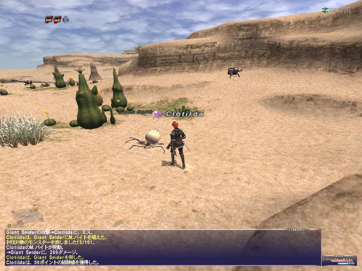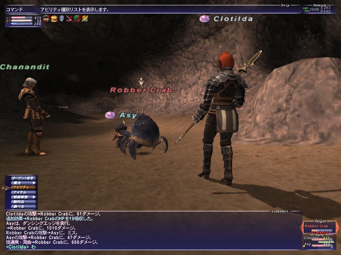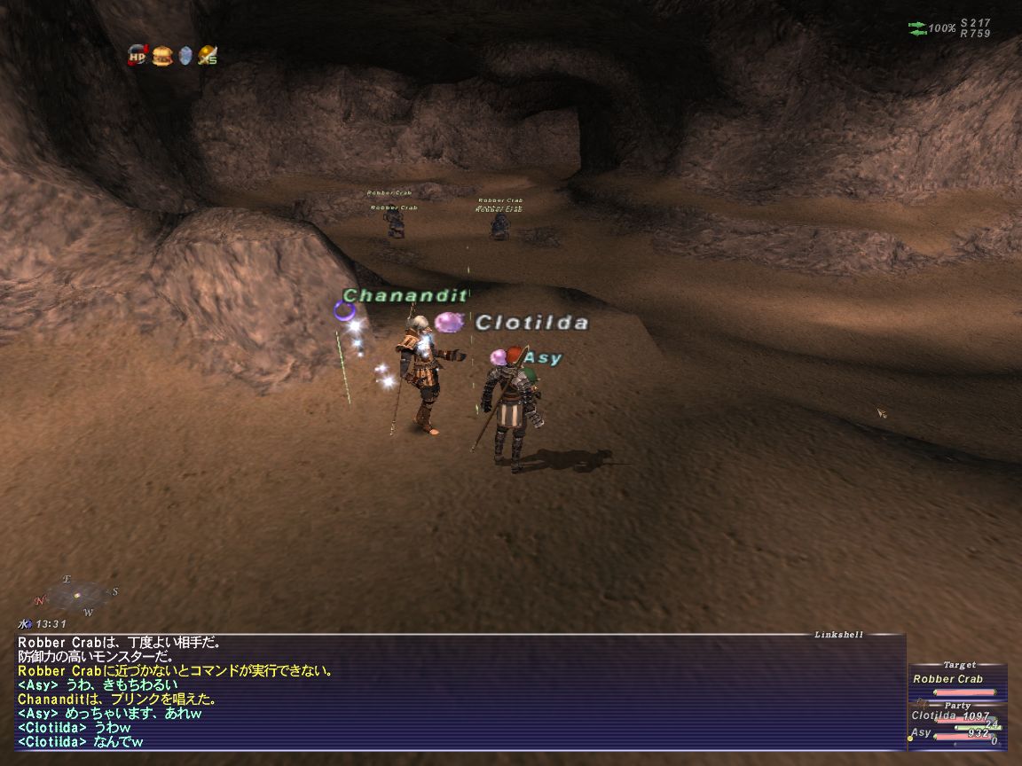 アズさんのフェロー上げに便乗して、槍スキル上げ。クフタルの洞穴にいるカニ相手が相手、大量にいてやりやすいです。でも、きもちわるいは、うんw