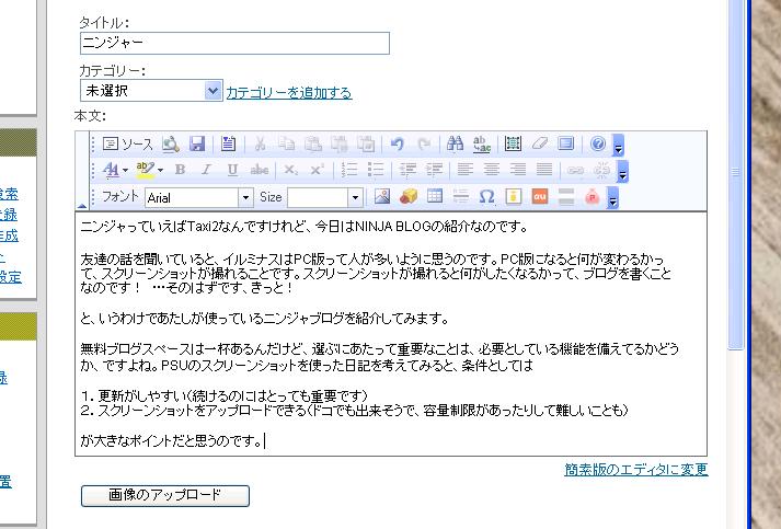 と、いうわけであたしが使っているニンジャブログを紹介してみます。無料ブログスペースは一杯あるんだけど、選ぶにあたって重要なことは、必要としている機能を備えてるかどうか、ですよね。PSUのスクリーンショットを使った日記を考えてみると、条件としては